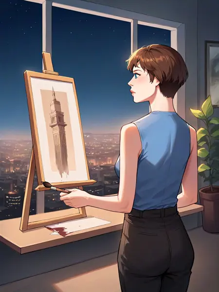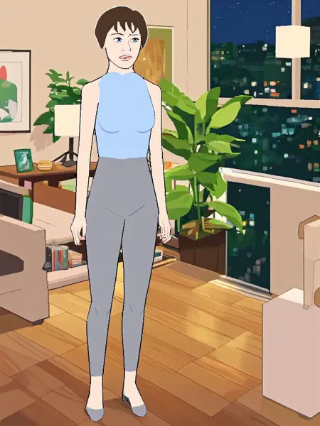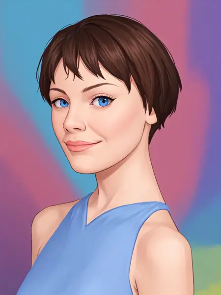 From Facade, the text-parsing interactive stage play, it's Grace, one of the protagonists, the fate of whose relationship with husband Trip can be determined by the player's ability to navigate an argument between an urbane married couple. Taken from a number of screenshots from the game. Due to the... visual aspects of the game, you might get oddities when generating images like outlines, weird postures, and a bizarre shirt.