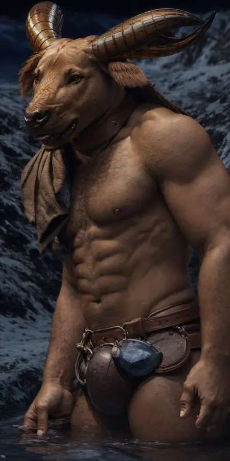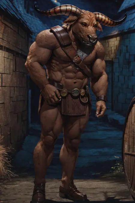 Follow with: 1boy, monster, minotaur, horns, fur, muscular male