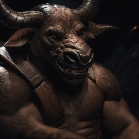 Greyhide, the minotaur blacksmith, from the game Seeds of Chaos by Venus Noire, check it out on Steam.