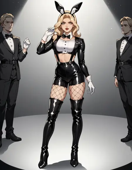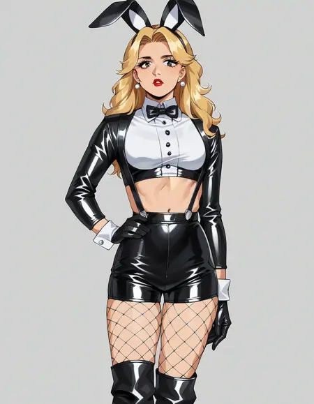 キーワード: hud_bunnie, 長袖, クロップトップ, 黒いショートパンツ, サスペンダー, 黒い蝶ネクタイ, フェイクの動物の耳, 手袋, キラキラした服, フィッシュネット, ブーツ, 全身