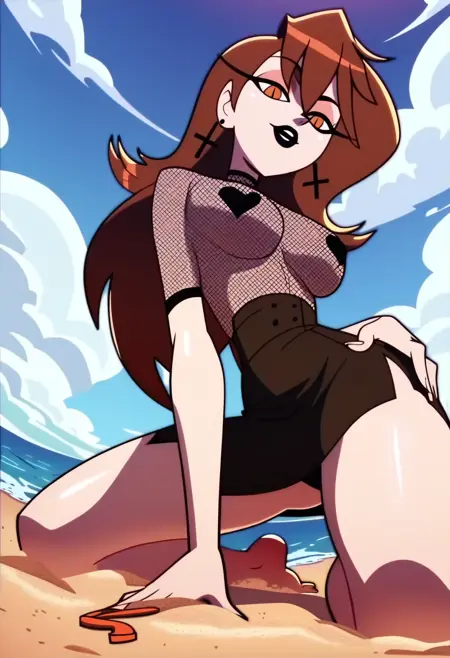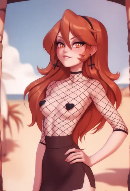 humankiki, brown hair, cross earrings, fishnet top, heart pasties, brown skirt, asymmetrical legwear