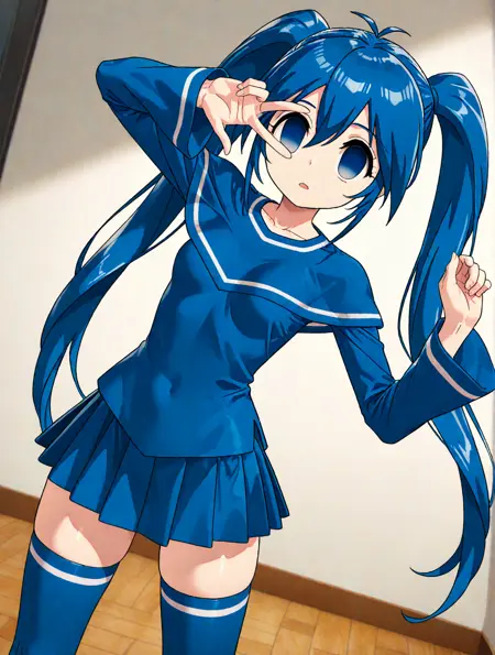 prompt : imaichi moenai ko,twintails,blue hair,very big eyes,empty eyes,blue eyes,zettai ryouiki,thighhighs,