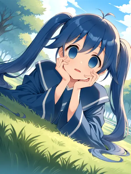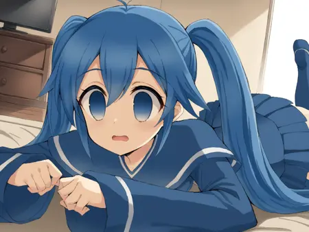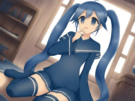 prompt : imaichi moenai ko,twintails,blue hair,very big eyes,empty eyes,blue eyes,zettai ryouiki,thighhighs,