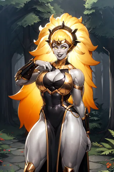 example prompt:DownbreakerDota, glowing hair, yellow eyes, glowing eyes, blonde_hair, colored_skin, grey skin, 1girl, armor, breastplate, full_body, long_hair, breasts, dress, from_below, long_hair, no_panties, pelvic_curtain, solo, thighs, smile, forest