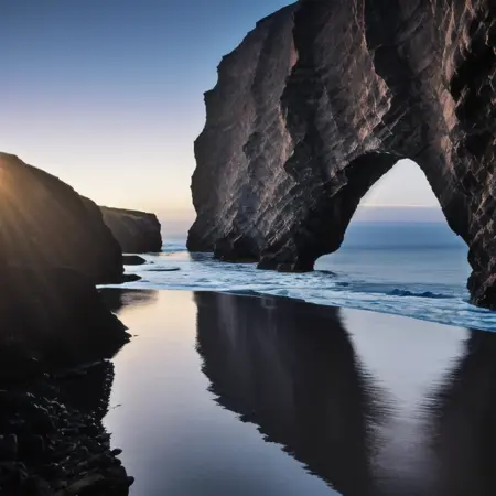 • Reflections of cliffs over an ocean, at dawn, 8k uhd, dslr, soft lighting, high quality, film grain, Fujifilm XT3