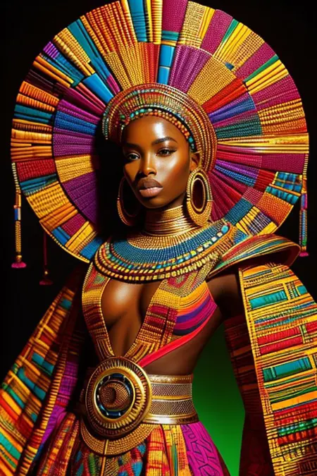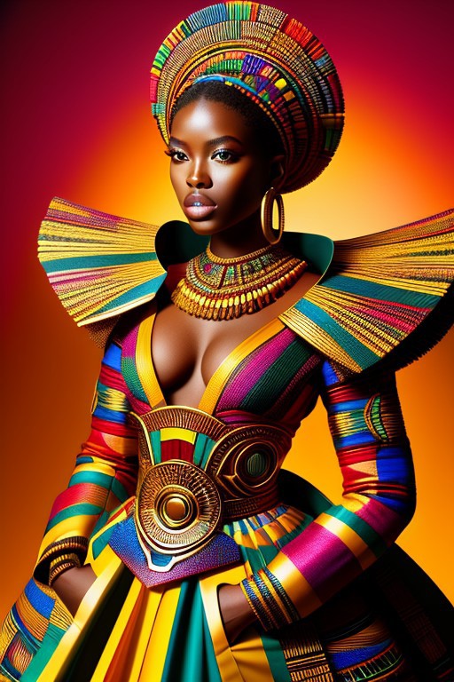 미래적, 현대적, 가나 및 세네갈 문화가 혼합된 판타지 의상