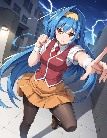 일반 복장: 노란 헤어밴드, 빨간 넥타이, 빨간 조끼, 흰 셔츠, 짧은 소매, 흰 팔찌, 주황색 치마, 주름 치마, 검은 팬티스타킹, 로퍼