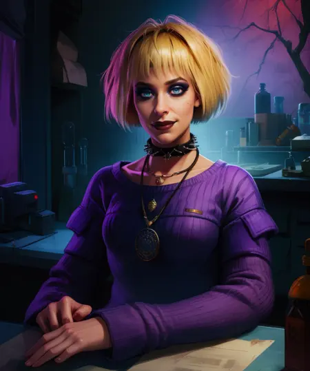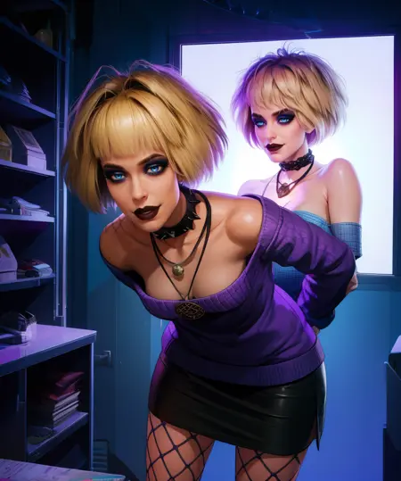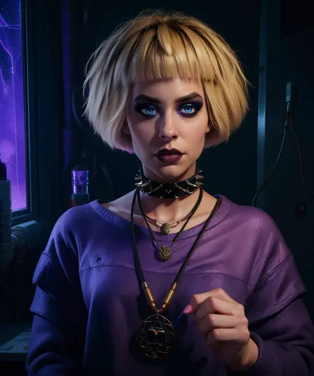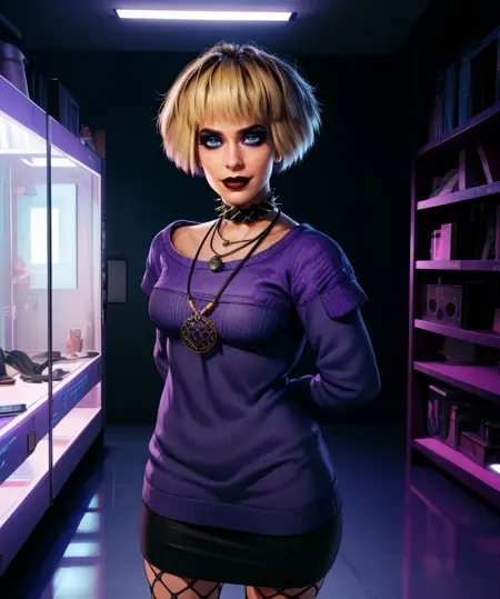 purple sweater, collarbone, choker, necklace, - pencil skirt, or black skirt, or miniskirt, - pantyhose, or fishnet pantyhose, black boots, or shoes,