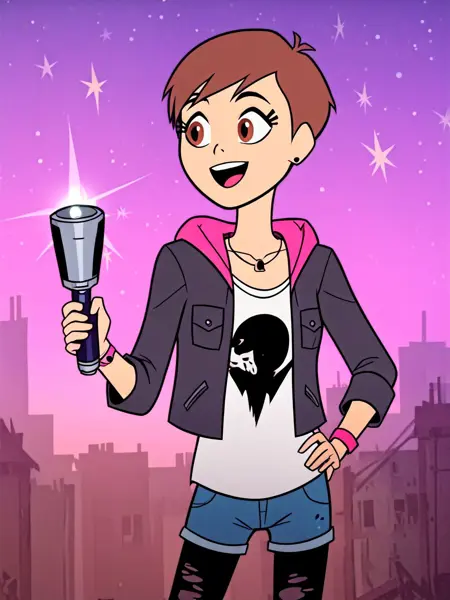outfit: (grey) shirt/tanktop, (pink) hoodie, (black) leather jacket, denim shorts, (black) earrings, necklace, bracelets, combat boots