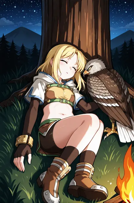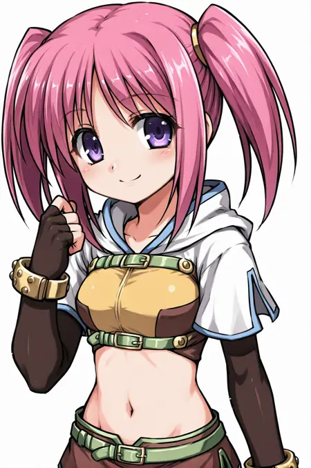 프롬프트: hunterRO, midriff, navel, crop top, brown skirt, black fingerless gloves, shorts under skirt, bike short, elbow gloves, belt, socks, crop top, bracelet, boots