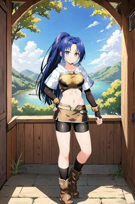 提示词:hunterRO,露脐,肚脐,短上衣,棕色短裙,黑色露指手套,裙下短裤,自行车短裤,肘部手套,腰带,袜子,短上衣,手镯,靴子
