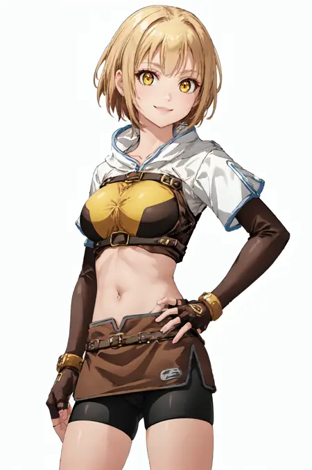 프롬프트: hunterRO, midriff, navel, gloves, crop top, brown miniskirt, shorts, fingerless elbow gloves, boots, bike shorts