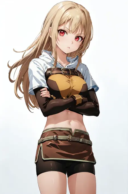 프롬프트: hunterRO, midriff, navel, crop top, brown skirt, black fingerless gloves, shorts under skirt, bike short, elbow gloves, belt, socks, crop top, bracelet, boots