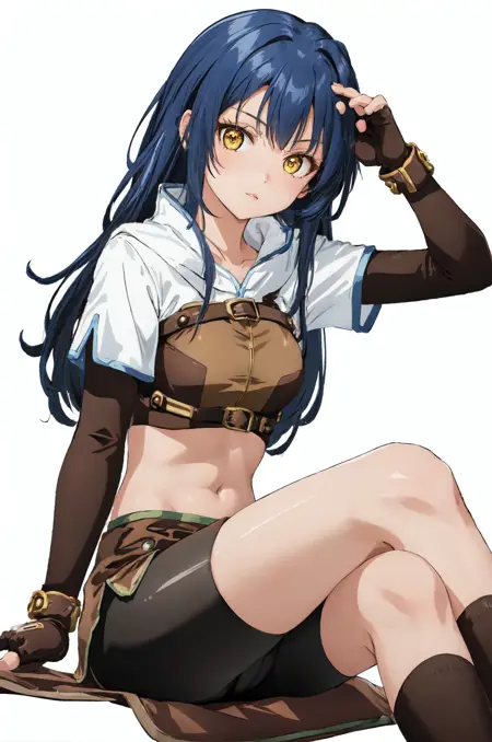 프롬프트: hunterRO, midriff, navel, gloves, crop top, brown miniskirt, shorts, fingerless elbow gloves, bike shorts, black knee sock