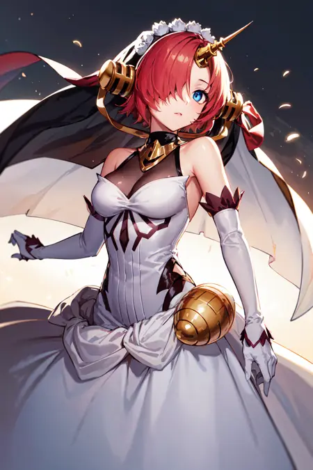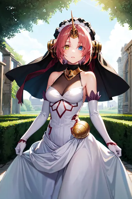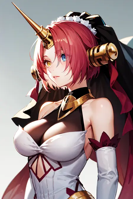 1girl, hair over eyes, heterochromia, blue eyes, yellow eyes, solo, frankenstein's monster \(fate\), mechanical horns, veil, elbow gloves, white dress, long dress, white gloves, short hair, pink hair, bare shoulders, medium breasts, headgear
