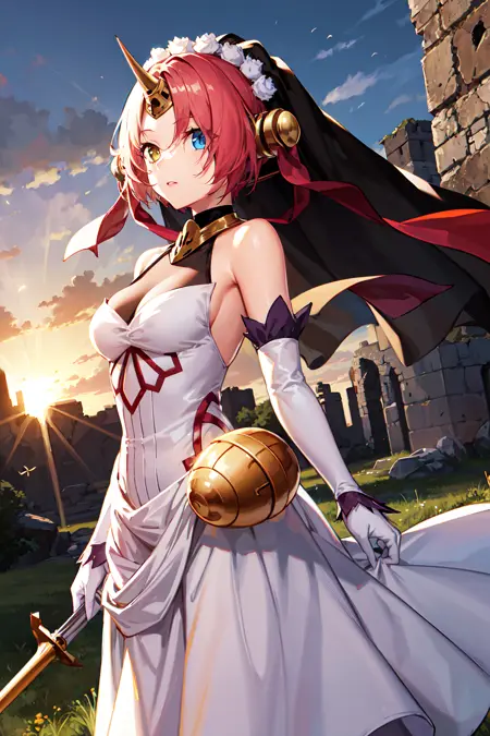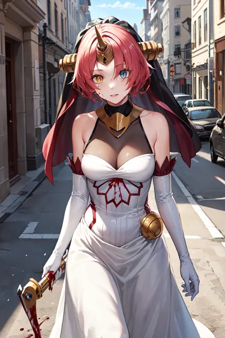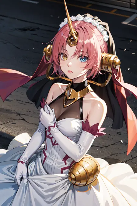 1girl, hair over eyes, heterochromia, blue eyes, yellow eyes, solo, frankenstein's monster (fate), mechanical horns, veil, elbow gloves, white dress, long dress, white gloves, short hair, pink hair, bare shoulders, medium breasts, headgear