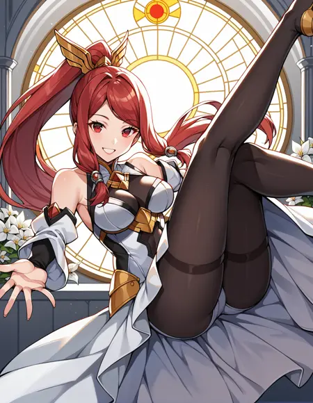 Normal Costume: hair ornament, hair tubes, bare shoulders, jewelry, armored dress, chest armor, armor, detached sleeves, arm armor, faulds, white skirt, black pantyhose, thighhighs, boots