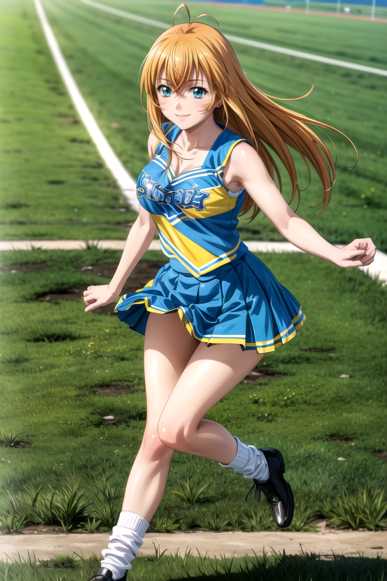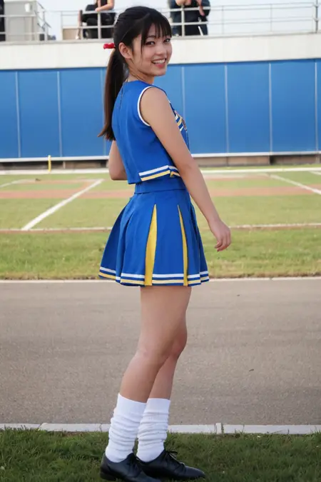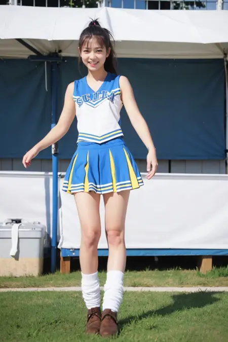 (pleated skirt, shoes, sleeveless, black footwear, blue skirt, sleeveless shirt, white socks, cheerleader)