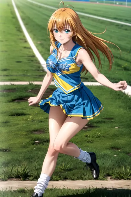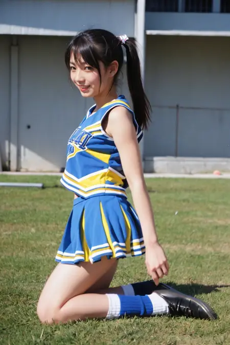 (百褶裙,鞋子,无袖,黑色鞋履,蓝色裙子,无袖上衣,白色袜子,啦啦队队员)