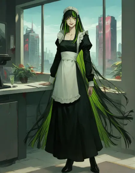 very long hair, multicolored hair, two-tone hair, streaked hair, colored inner hair, green hair, black hair