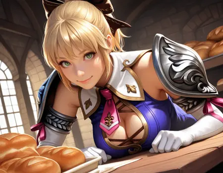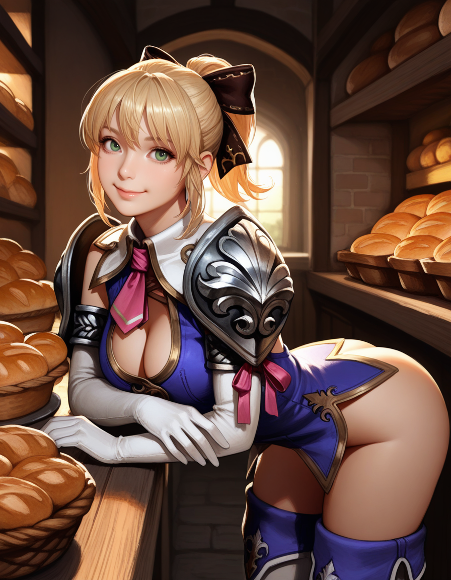 • 正向提示词:1girl, cassandra alexandra, 金色马尾辫, 绿色眼睛, 领结, 肩部护甲, 护甲, 乳沟, 肘部手套, 过膝袜, 大腿靴