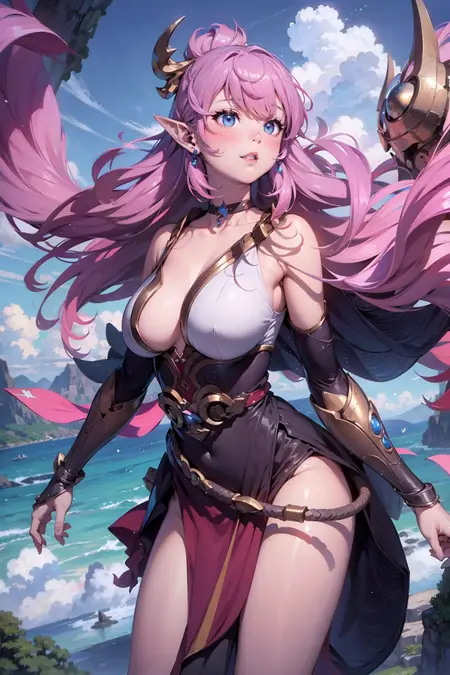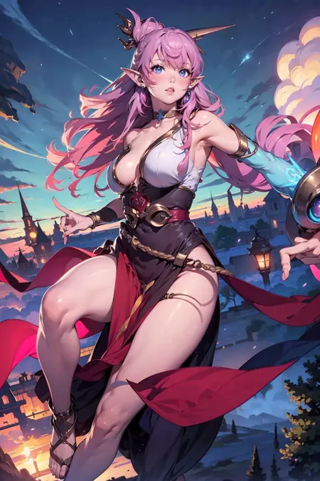 tel'annas weathering mist, 1girl, solo, long hair, hair ornament, pink hair, multicolored hair, hair stick, bangs, pointy ears, earrings, looking at viewer, blue eyes, lips, choker, breasts, large breasts, bare shoulders, dress, pelvic curtain, cleavage, jewelry, legs, wings, barefoot, feet, toes, elf, orb