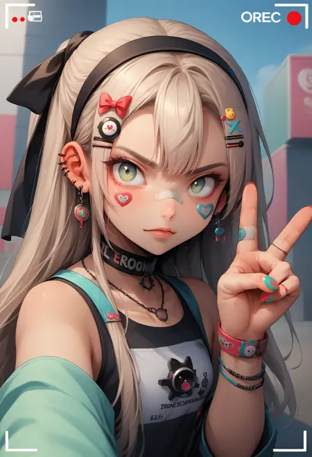 머리 장식, 머리핀, 귀 천공, 얼굴에 붙인 반창고, 반지, 카고, 목걸이, 손에 붙인 반창고, 문신