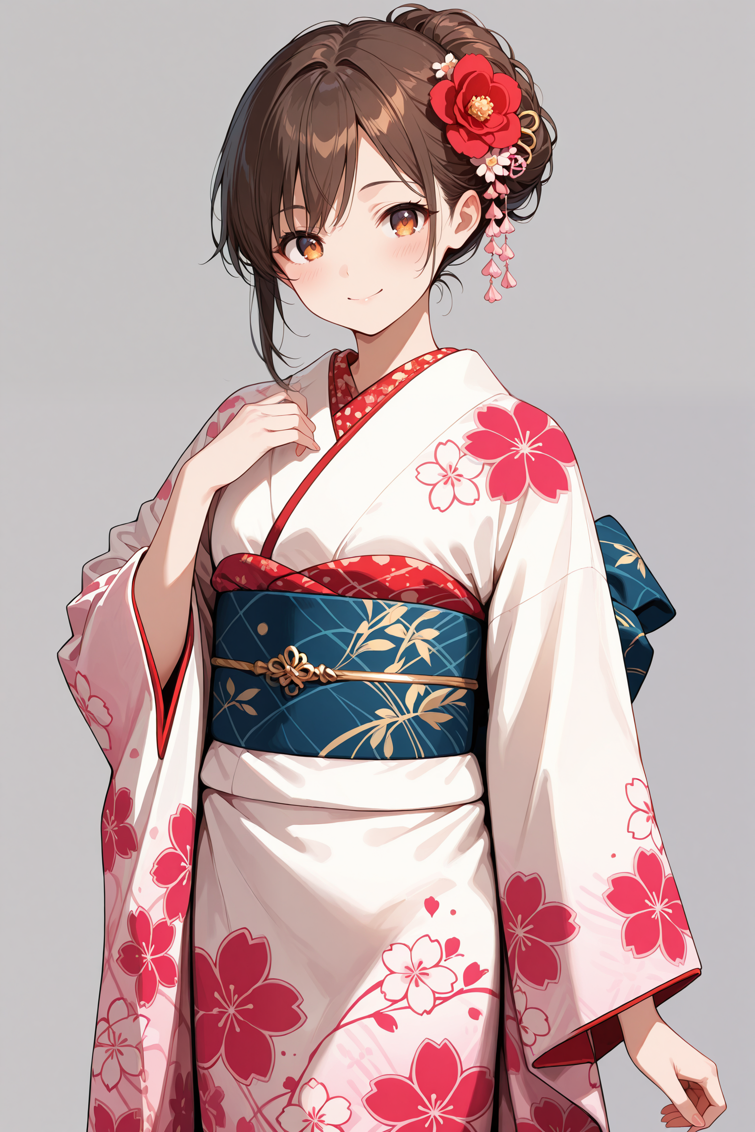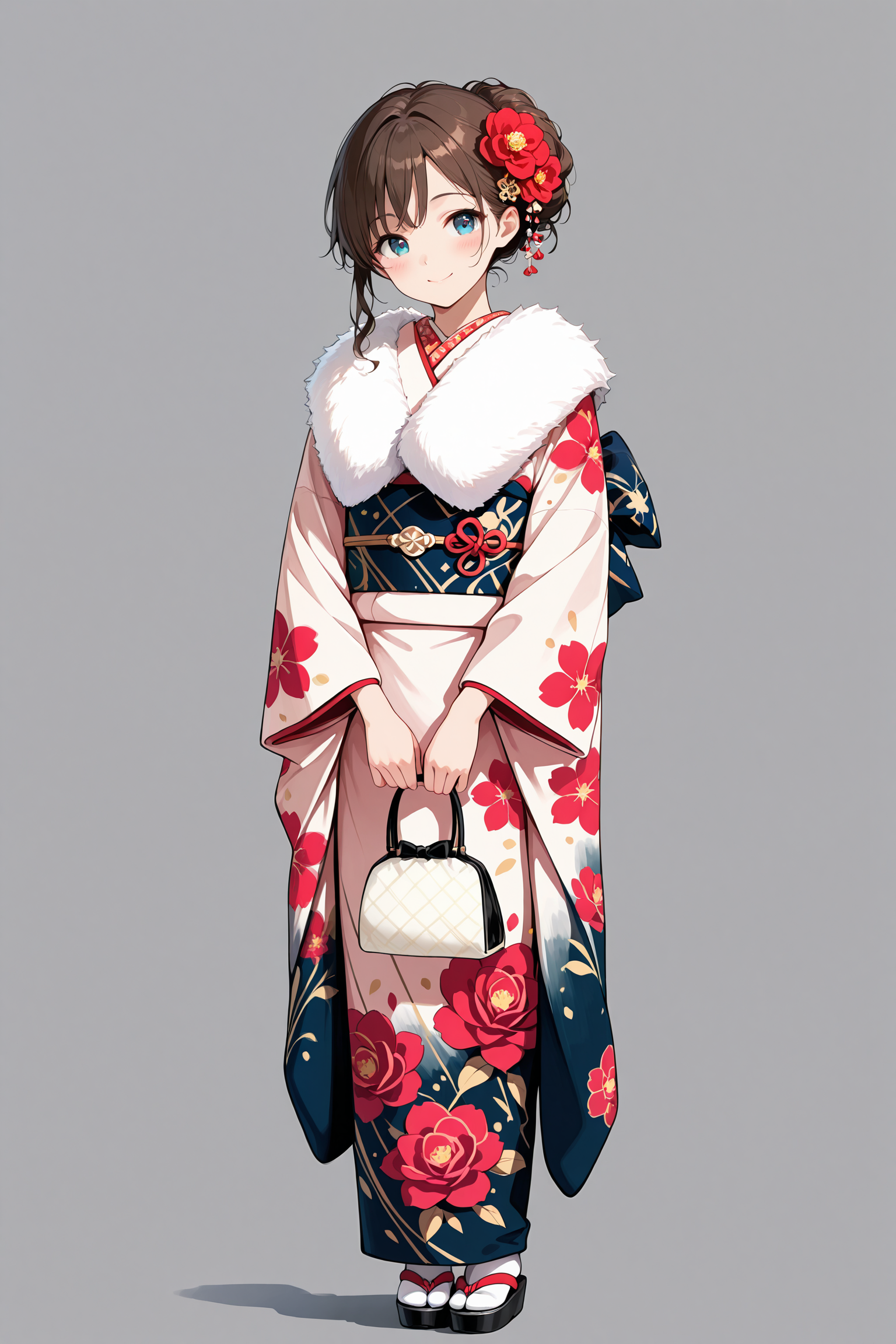 furisode,obi,floral print,hair ornament,wide sleeves,fur trim