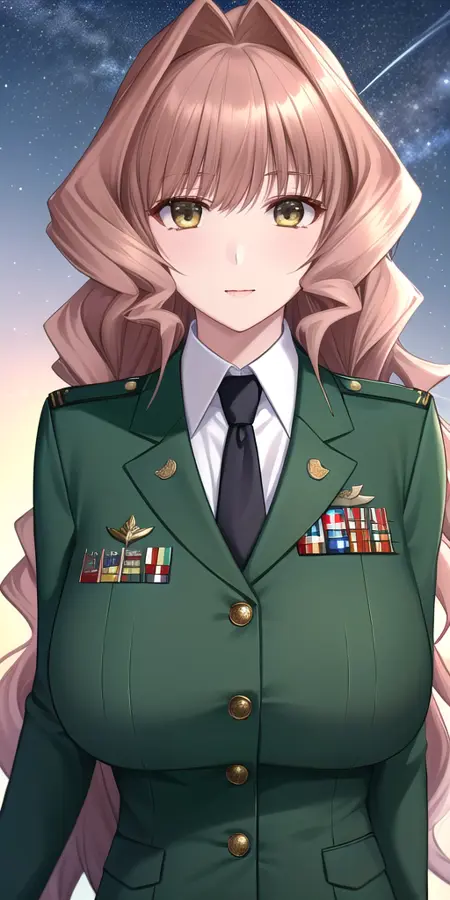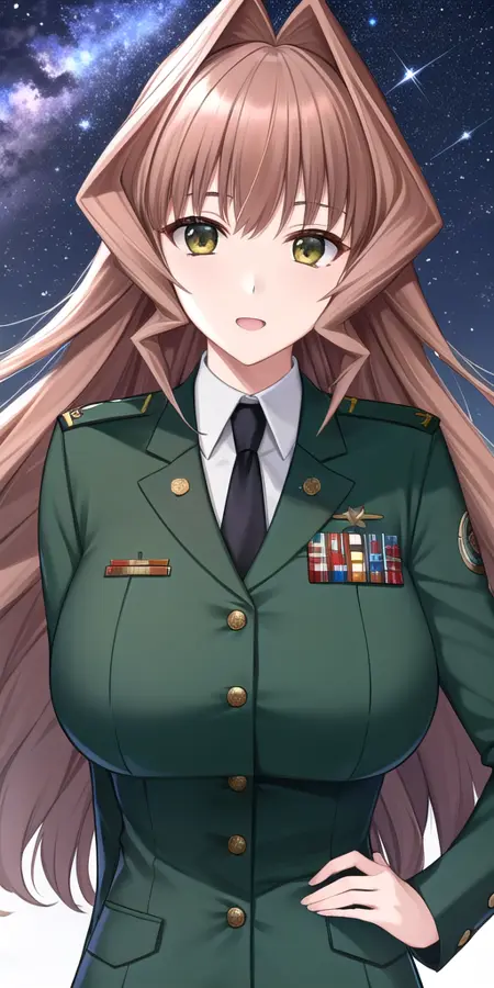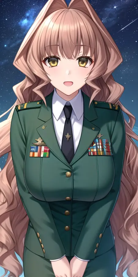 - green_military_uniform_green_jacket_green_pencil_skirt_White_collared_shirt_black_necktie_pantyhose_badge_military_rank_insignia_medal:彼女の市長用衣装。