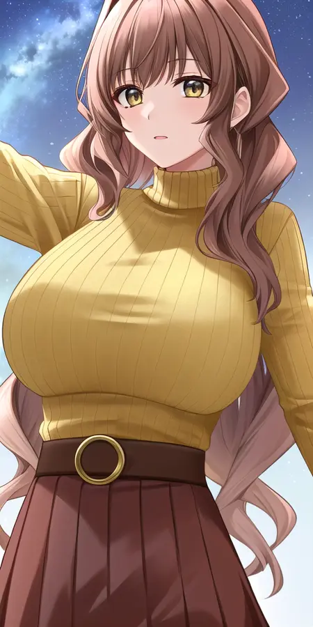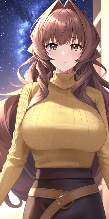 - yellow_ribbed_sweater_turtleneck_brown_long_skirt_brown_belt_pendant:彼女のクラシックな教師の衣装。