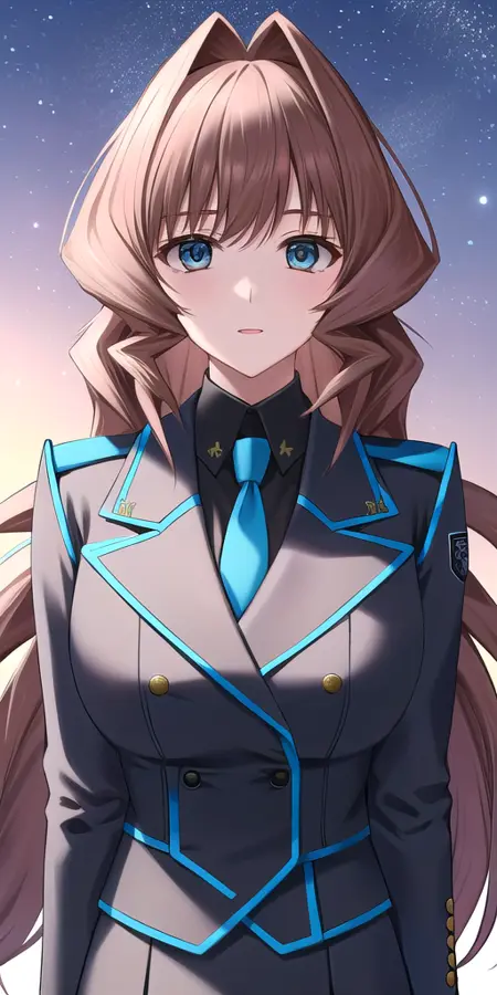 - black_military_jacket_black_collared_shirt_blue_necktie_double-breasted_sleeve_cuffs_black_pants_insignia_shoulder_patch:彼女のブラック&ブルーの軍人用衣装。