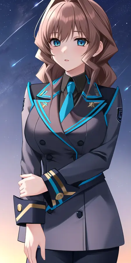 black_military_jacket_black_collared_shirt_blue_necktie_double-breasted_sleeve_cuffs_black_pants_insignia_shoulder_patch:她的黑蓝配色军官制服。