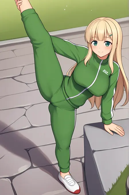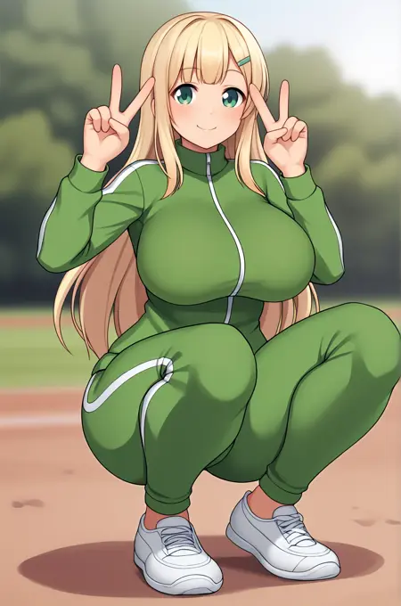 她的休闲服装触发词为:"Yomi_Casual, 绿色运动服, 绿色运动夹克, 绿色运动裤, Yomi 运动鞋"。