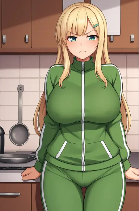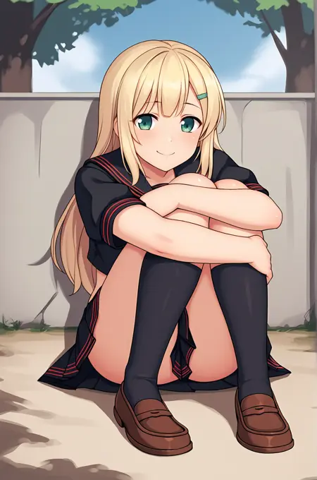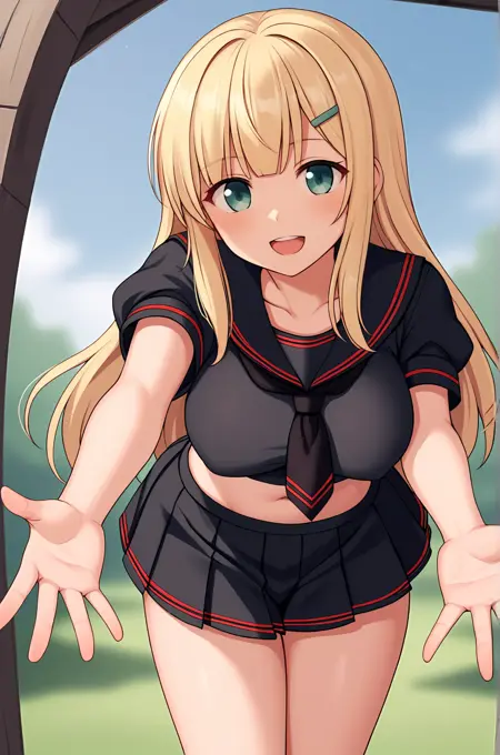 LoRA 的触发词为 "Yomi_XL, 绿色眼睛, 金色头发, 长发, 绿色发夹, 大乳房"。