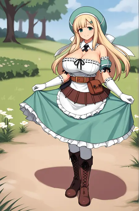 她的忍者服装触发词为:"Yomi_Shinobi, 绿色贝雷帽, 白色蝴蝶结, 丝带, 绿色连衣裙, 分离式衣领, 白色围裙, 肘部手套, 裸露肩膀, 高耸胸脯, 花边, 腰带包, 棕色子弹带, 白色腿袜, 系带靴"。