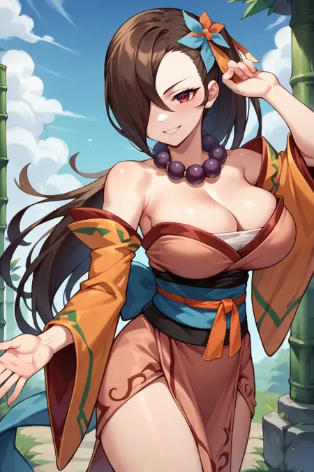通常姿には「defKagero, ponytail, hair over one eye, yellow scarf, japanese clothes, purple dress, plunging neckline, cleavage, purple sleeves, arm guards, sandals」を追加してください。