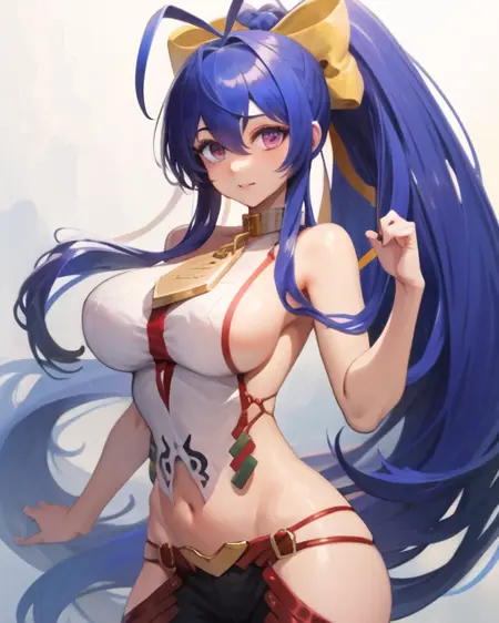 bow, ribbon, sidelocks, bare shoulders, halterneck, backless outfit, sideboob, pants, lowleg pants,