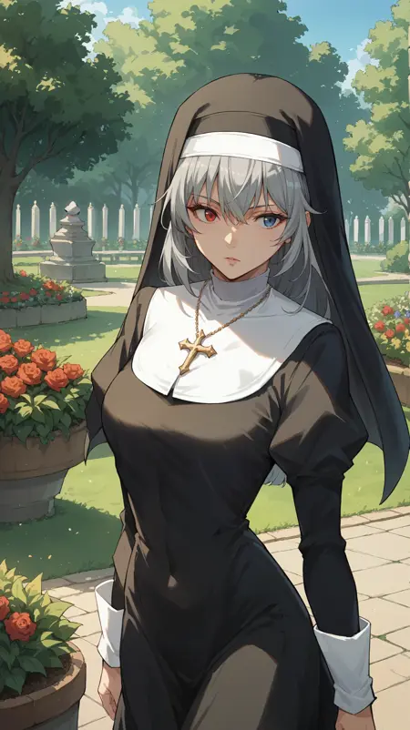 long hair, grey hair, (heterochromia), red eye and blue eye, black skirt, white collar, hair ribbon, black arm guards, short sleeves