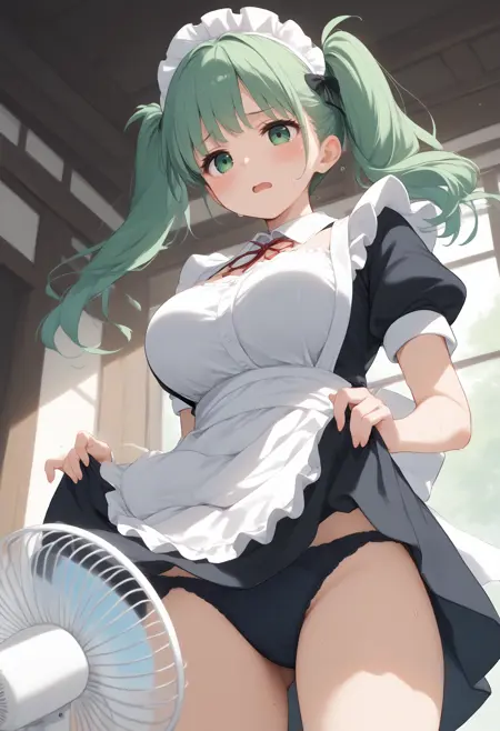If you only use the trigger, it will just passively receive the breeze. To convey the feeling of desperately seeking a breeze in the midst of extreme heat, consider adding terms like “panties,” “underwear,” “blush,” “sweat,” “hot,” and “open mouth.” Then, select prompts from options like “lifted by self,” “navel,” “bra,” “wind lift,” “barefoot,” “sitting,” “shirt lift,” “clothes lift,” “full body,” and “hand fan” to create your preferred scenario.