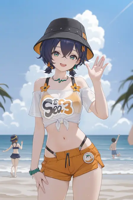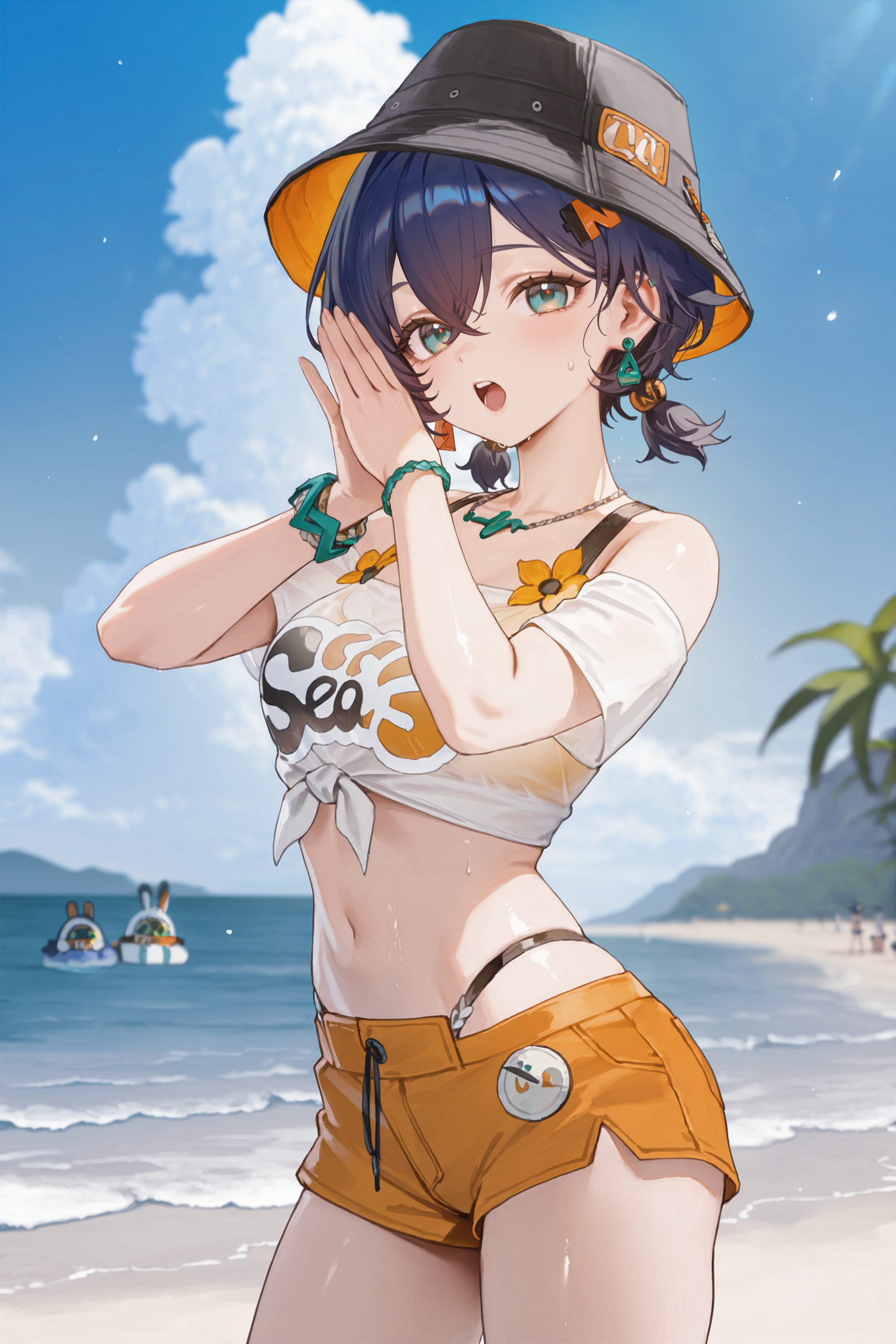 여름 하늘 의상 추가 프롬프트: 글자 모양 헤어클립, 귀걸이, 목걸이, 낮은 트윈테일, 검은 버킷 모자, 어깨 노출 크롭탑, 비키니 내의, 주황색 스포츠 비키니, 주황색 단축 바지, 발목 장식, 크로크스