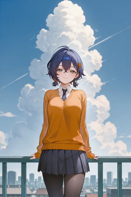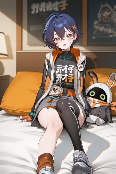 기본 의상 추가 프롬프트: 글자 모양 헤어클립, 귀걸이, 목걸이, 검은 셔츠, 소매 없는 후드 재킷, 한쪽 손가락 없는 장갑, 한쪽 손가락 없는 장갑, 팔찌, 회색 계층 스커트, 한쪽 검은 허벅지 백, 한쪽 주황색 양말, 비대칭 다리 착장, 슬리퍼