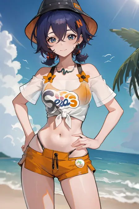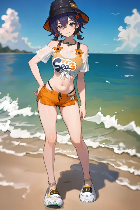 Additional prompts for Summer Skies: letter hairclip, earrings, necklace, low twintails, black bucket hat, off-shoulder crop top, bikini under clothes, orange sports bikini, orange short, anklet, crocs