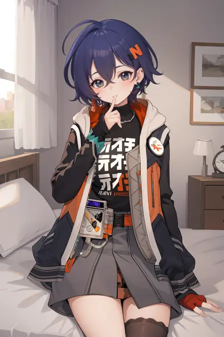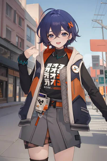 Additional prompts for Default Costume: letter hairclip, earrings, necklace, black shirt, sleeveless hooded jacket, single fingerless glove, single fingerless glove, bracelet, grey layered skirt, single black thighhigh, single orange sock, asymmetrical legwear, sneakers