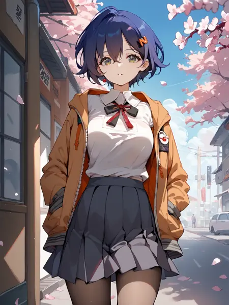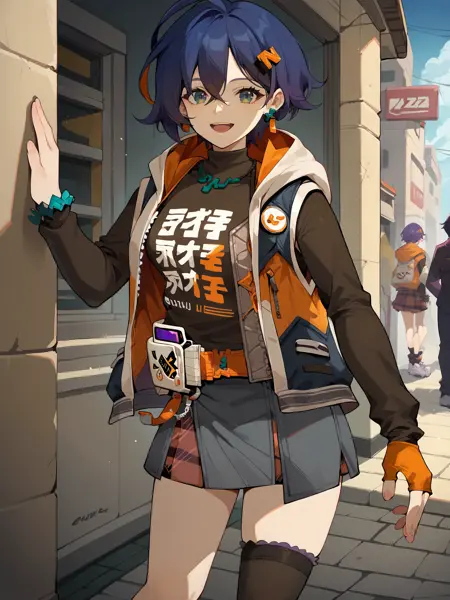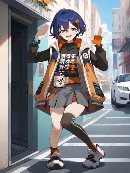 기본 의상 추가 프롬프트: 글자 모양 헤어클립, 귀걸이, 목걸이, 검은 셔츠, 소매 없는 후드 재킷, 한쪽 손가락 없는 장갑, 한쪽 손가락 없는 장갑, 팔찌, 회색 계층 스커트, 한쪽 검은 허벅지 백, 한쪽 주황색 양말, 비대칭 다리 착장, 슬리퍼
