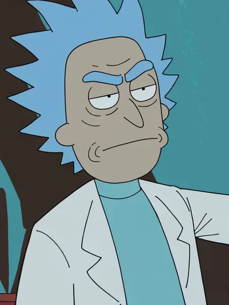 릭, 1남자, 파란 머리카락, 검은 동공, 스파이크 모양 머리, 랩 coat, 긴 소매, 파란 셔츠