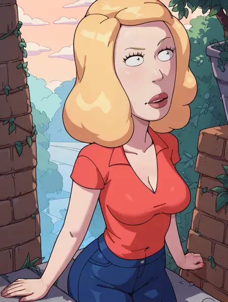 벳 스미스, 금발, 빨간 셔츠, 파란 바지, 검은 동공