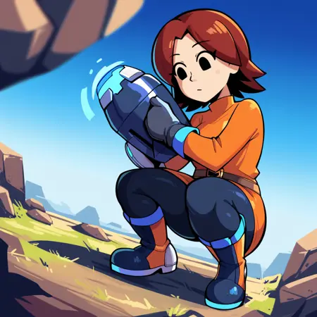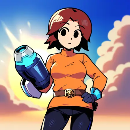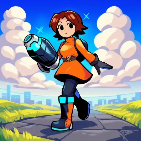 orange dress, long sleeves, black pants, gloves, boots, arm cannon, belt