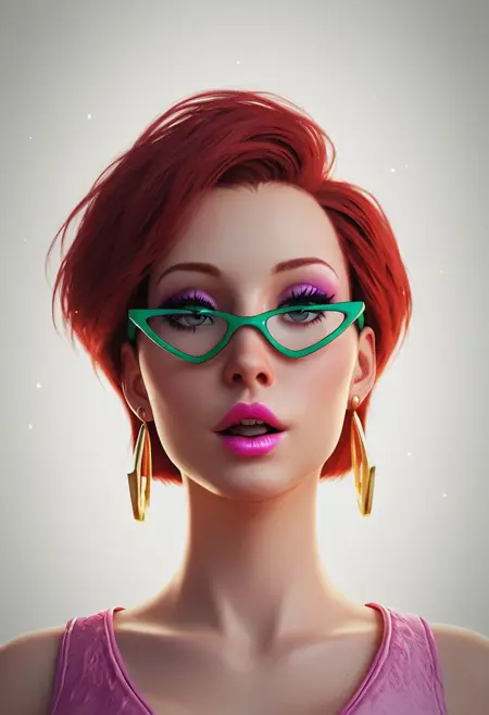 score_9, score_8_up, score_7_up, rating_explicit, 1girl, solo, janine_melnitz, pointy green glasses, short red hair, pink lipstick, makeup, jewelry, earrings, short red hair, pink lipstick, pink vest, horny, sexy, close up, parted lips, white background, simple background,