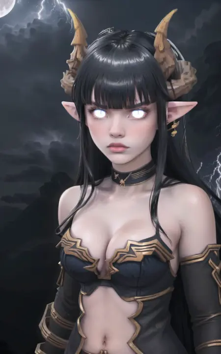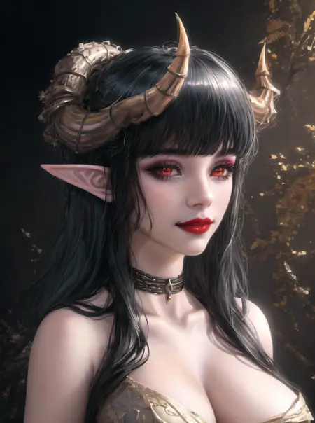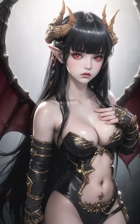 PREFERABLE TAGS: horns, wings, choker, black armor, skimpy outfit, gauntlets, claws, slightly exposed breasts, black thighhighs, boots, black hair, red eyes, medium breasts, thick thighs