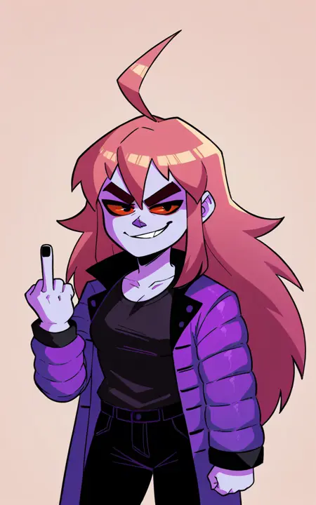 badeline, purple skin, lavender hair, long hair, ahoge, red eyes, black sclera, thick eyebrows